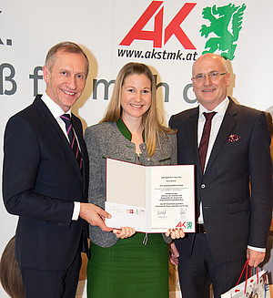 Jedes Jahr zeichnet die Arbeiterkammer (AK) Steiermark exzellente wissenschaftliche Arbeiten aus, die sich mit Bildungsthemen, Arbeitsrecht, Konsumentenschutz, Pflege oder Frauenthemen beschäftigen. Dieses Jahr war RCE-Mitarbeiterin Petra Wlasak, PhD unter den PreisträgerInnen. Ihre Dissertation „Transdisziplinäre Nachhaltigkeitsforschung: Innovative Lösungsansätze im Spannungsfeld Migration, Flucht und Gender“ wurde von der interdisziplinären Jury als ausgezeichnet beurteilt. Der Preis wurde im Rahmen einer festlichen Verleihung am 22. November 2018 durch AK-Präsident Josef Pesserl und AK-Direktor Dr. Wolfgang Bartosch verliehen. Die Dissertation von Petra Wlasak, PhD wurde außerdem mit dem Leistungsstipendium der URBI-Fakultät gewürdigt.